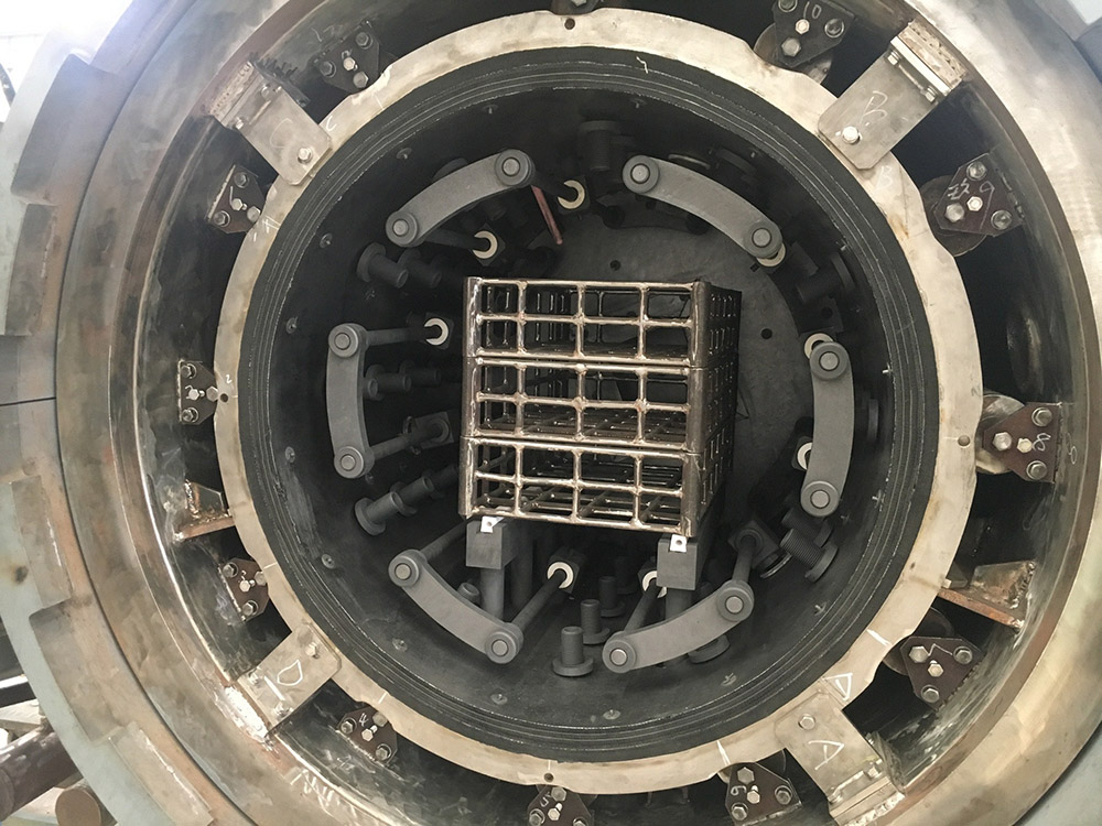 加熱室(爐膽)由隔熱層、加熱元件、石墨噴管和料臺等組成。隔熱層為三層石墨軟氈(20mm)和一層石墨硬氈(30mm)組成的圓形結構。其結構保溫性能好,硬氈特點:在氣淬時不會被強風吹掉保溫層,大大的提高了加熱室的使用壽命。隔熱層被固定在由不銹鋼板網和角鋼圈組成的加室框架上;前、后蓋裝有固定風門,風門邊上包有CFC材料防止氣流沖刷。 加熱元件采用石墨管,用陶瓷件絕緣。加熱元件沿隔熱層內壁圓周方向均勻布置,加熱均勻、熱損失小;可單獨拆卸,且更換方便。石墨噴管為多列石墨噴管,均勻的沿隔熱層內壁圓周方向分布在加熱室里。在氣淬時強制氣體均勻的從石墨噴管噴出,有效的達到均勻淬火。料臺由石墨支柱、石墨爐床和爐床上的Si2O3隔條組成。此結構可防止高溫時料盤和石墨爐床的粘結。加熱溫區分為1區。1溫區獨立加熱,1溫區獨立控溫。整個圓形加熱室沿爐體長度方向劃分為一個環形單元。絕緣子采用高純氧化鋁絕緣瓷件,具備高溫絕緣。